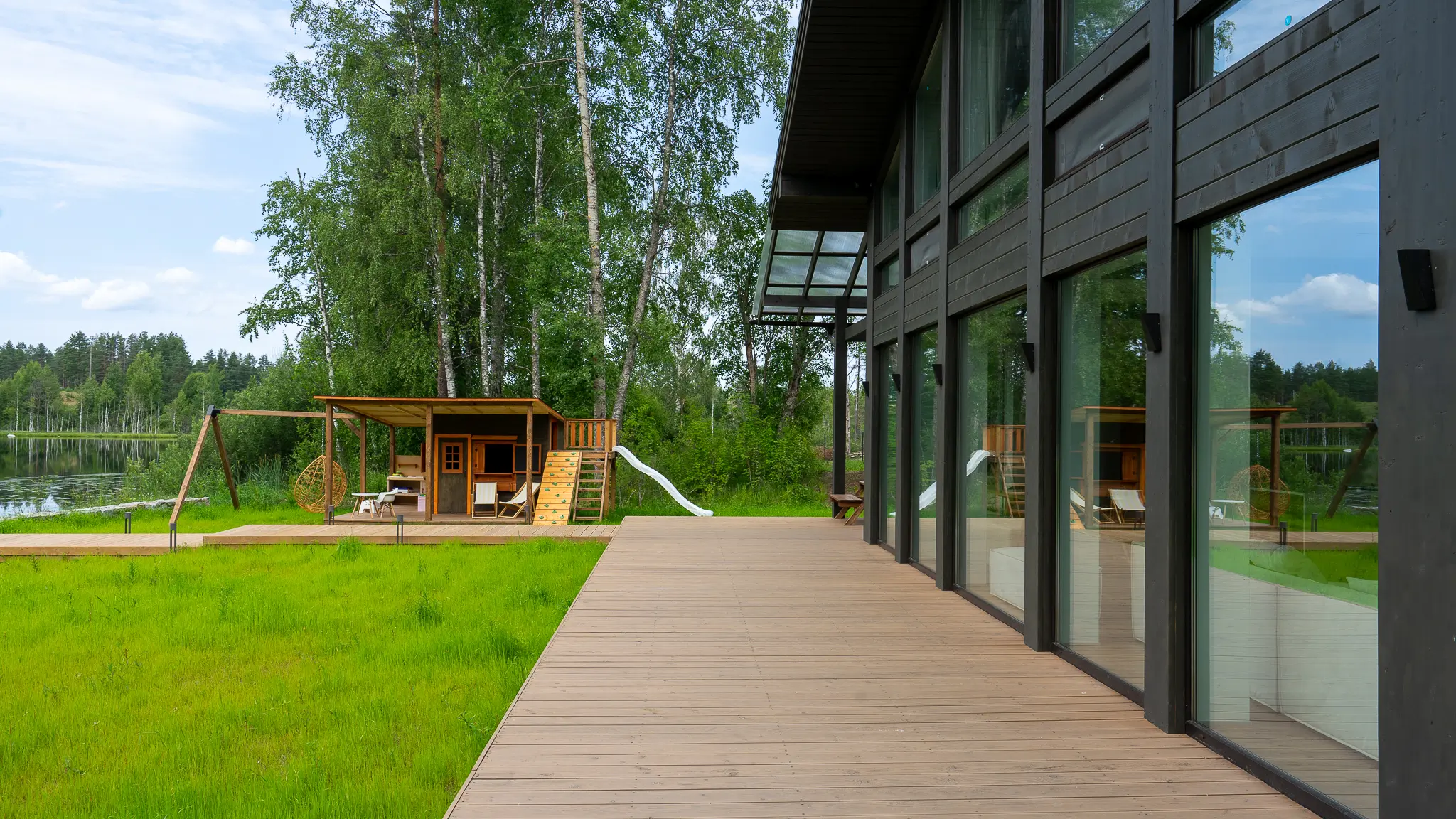 Поселок в едином стиле, современная архитектура, панорамное остекление, эффект присутствия природы в интерьере дома.